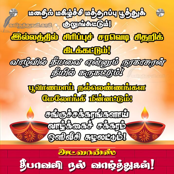 மனதில் மகிழ்ச்சி மத்தாப்பு பூத்துக் குலுங்கட்டும்!இல்லத்தில் சிரிப்புச் சரவெடி சிதறிக் கிடக்கட்டும்!வாழ்வில் தீயவை என்னும் நரகாசுரன் தீயில் கருகட்டும்!பூவாணமாய் நல்லெண்ணங்கள மேலோங்கி மின்னட்டும்!சங்குச்சக்கரங்களாய் வாழ்க்கைச் சக்கரம் ஒளிவீசி சுழலட்டும்!இனிய அட்வான்ஸ் தீபாவளி நல் வாழ்த்துகள்!