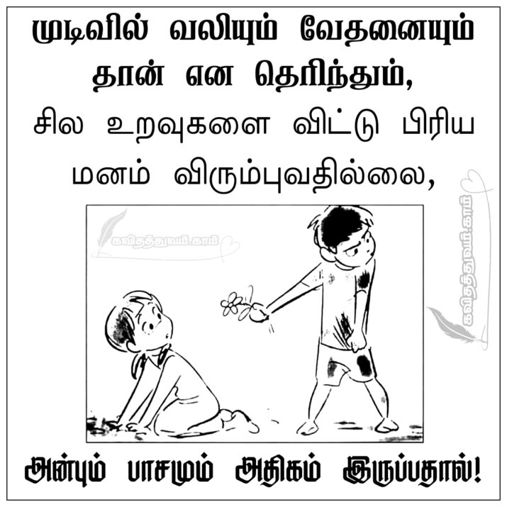 முடிவில் வலியும் வேதனையும் தான் என தெரிந்தும், சில உறவுகளை விட்டு பிரிய மனம் விரும்புவதில்லை, அன்பும் பாசமும் அதிகம் இருப்பதால்!