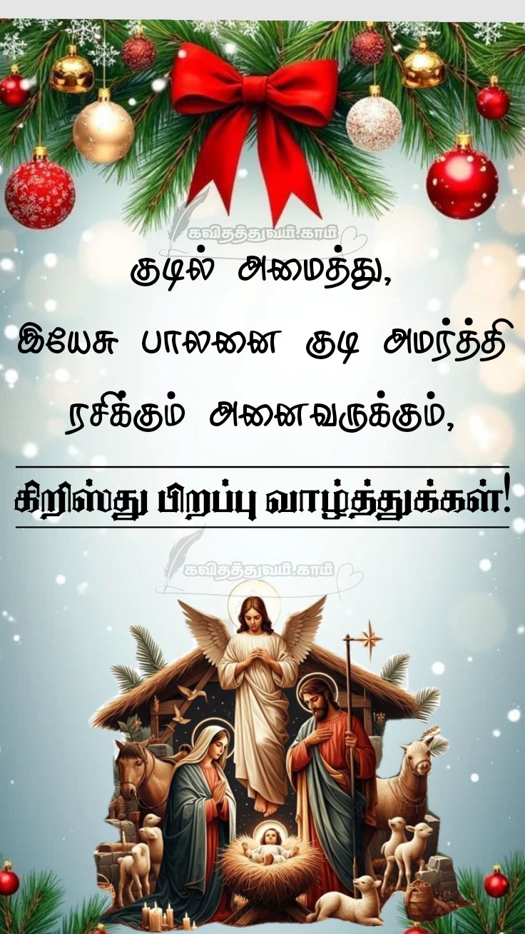 குடில் அமைத்து, இயேசு பாலனை குடி அமர்த்த தயாராகும் அனைவருக்கும் மற்றும் அதை கண்டு மகிழும் அனைவருக்கும், கிறிஸ்து பிறப்பு வாழ்த்துக்கள்! 0 kavithathuvam.com on December 24, 2025 Share on Facebook Framed Photos ==>>CLICK HEAR TO VIEW<<== Lord Murugan Photos | Lord Shiva Photos | Radhakrishnan And Shivan Parvathi Photos | Jesus Photos | Mother Mary Photos | St Antony Photos | Bible Verse Photo Frames Download பார்த்தவர்கள் எண்ணிக்கை: 11 படித்து பிடித்ததை பகிர்ந்து படிக்க வையுங்கள்: Share Whatsapp Messenger Post Pinterest Print Share Email திருவிழா வாழ்த்துக்கள்