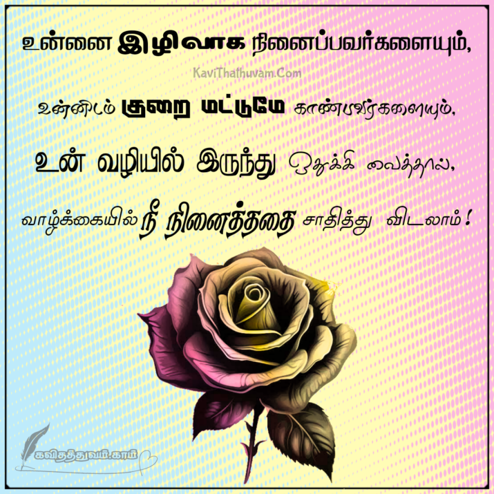 உன்னை இழிவாக நினைப்பவர்களையும், உன்னிடம் குறை மட்டுமே காண்பவர்களையும், உன் வழியில் இருந்து ஒதுக்கி வைத்தால், வாழ்க்கையில் நீ நினைத்ததை சாதித்து விடலாம்!
