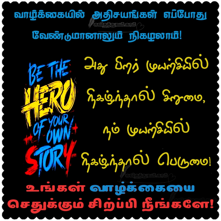 வாழ்க்கையில் அதிசயங்கள் எப்போது வேண்டுமானாலும் நிகழலாம். அது பிறர் முயற்சியில் நிகழ்ந்தால் சிறுமை, நம் முயற்சியில் நிகழ்ந்தால் பெருமை! உங்கள் வாழ்க்கையை செதுக்கும் சிற்ப்பி நீங்களே!