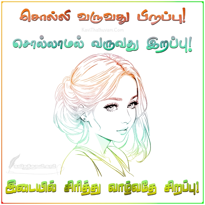 சொல்லி வருவது பிறப்பு! சொல்லாமல் வருவது இறப்பு! இடையில் சிரித்து வாழ்வதே சிறப்பு! 0 kavithathuvam.com on January 28, 2025 Share on Facebook Framed Photos ==>>CLICK HEAR TO VIEW<<== Lord Murugan Photos | Lord Shiva Photos | Radhakrishnan And Shivan Parvathi Photos | Jesus Photos | Mother Mary Photos | St Antony Photos | Bible Verse Photo Frames Download பார்த்தவர்கள் எண்ணிக்கை: 166 படித்து பிடித்ததை பகிர்ந்து படிக்க வையுங்கள்: Share Whatsapp Messenger Post Pinterest Print Share Email வாழ்க்கை கவிதைகள் இறப்புபிறப்பு