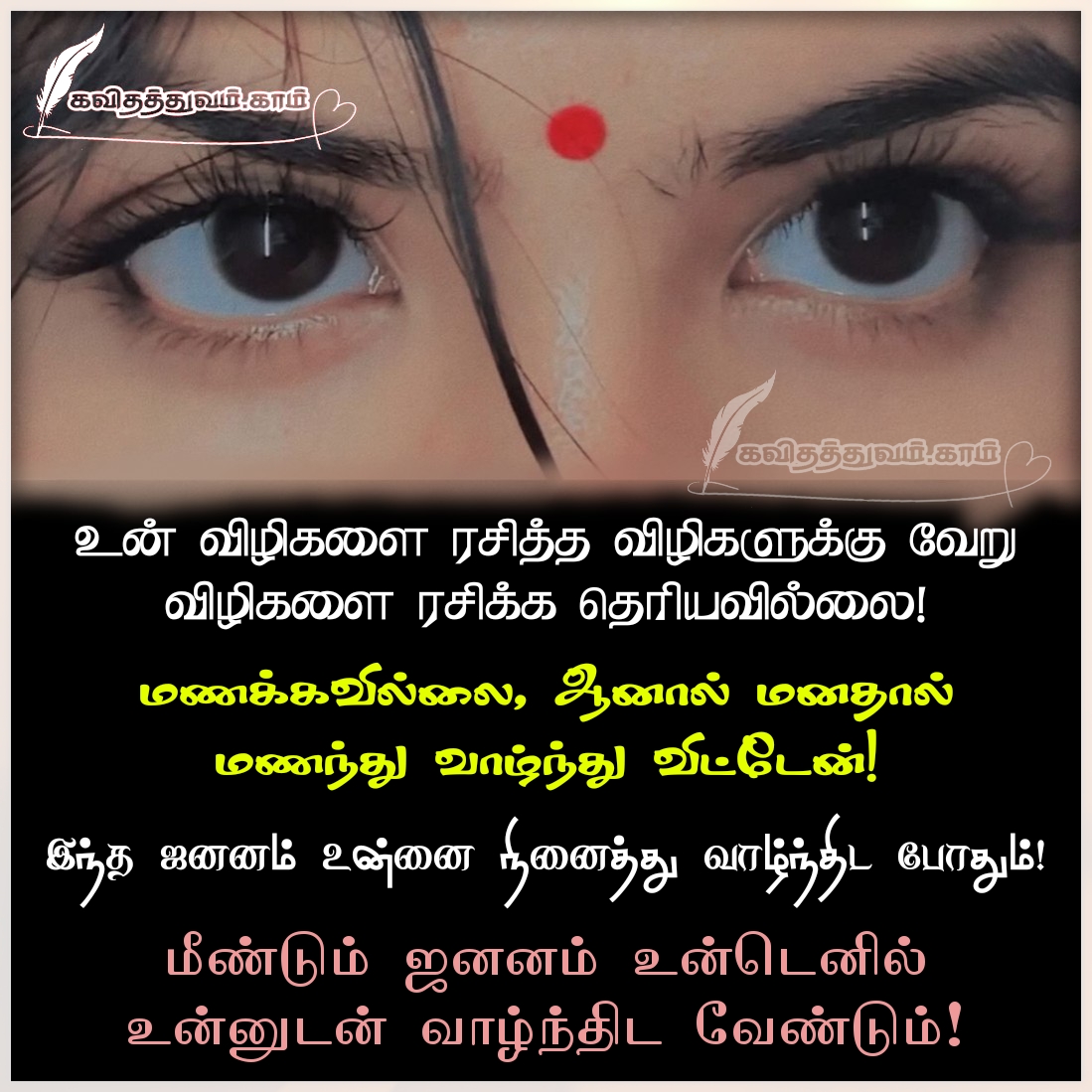உன் விழிகளை ரசித்த விழிகளுக்கு வேறு விழிகளை ரசிக்க தெரியவில்லை! மணக்கவில்லை, ஆனால் மனதால் மணந்து வாழ்ந்து விட்டேன்! இந்த ஜனனம் உன்னை நினைத்து வாழ்ந்திட போதும்! மீண்டும் ஜனனம் உன்டெனில் உன்னுடன் வாழ்ந்திட வேண்டும்!
