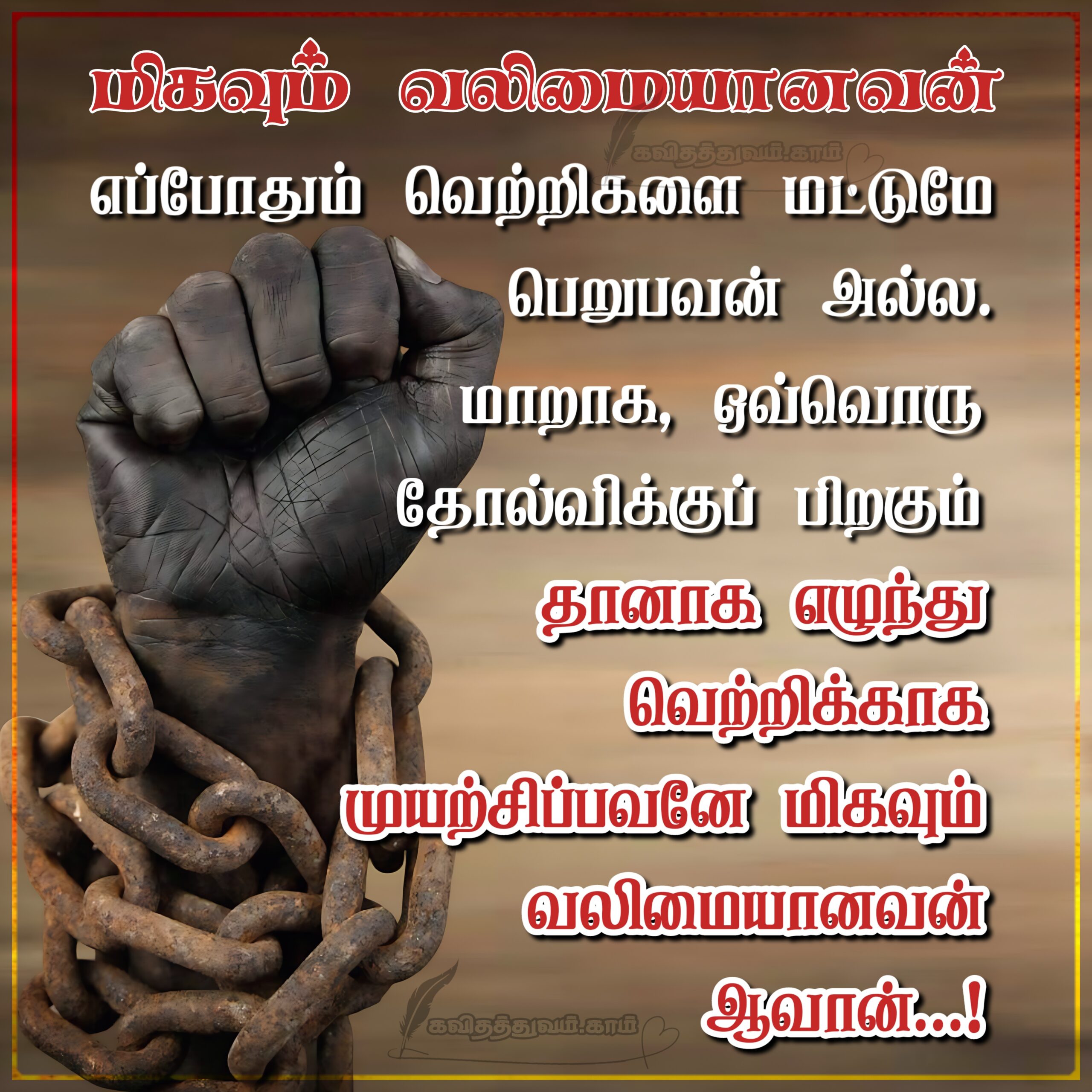 மிகவும் வலிமையானவன் எப்போதும் வெற்றிகளை மட்டுமே பெறுபவன் அல்ல. மாறாக ஒவ்வொரு தோல்விக்குப் பிறகும் தானாக எழுந்து வெற்றிக்காக முயற்சிப்பவனே மிகவும் வலிமையானவன் ஆவான்…!