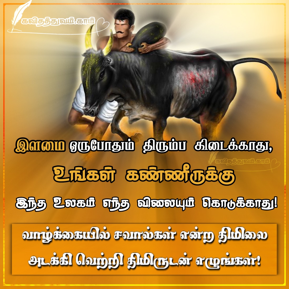 இளமை ஒருகாலமும் திரும்ப கிடைக்காது, உங்கள் கண்ணீருக்கு இந்த உலகம் எந்த விலையும் கொடுக்காது! வாழ்க்கையில் சவால்கள் என்ற திமிலை அடக்கி வெற்றி திமிருடன் எழுங்கள்!