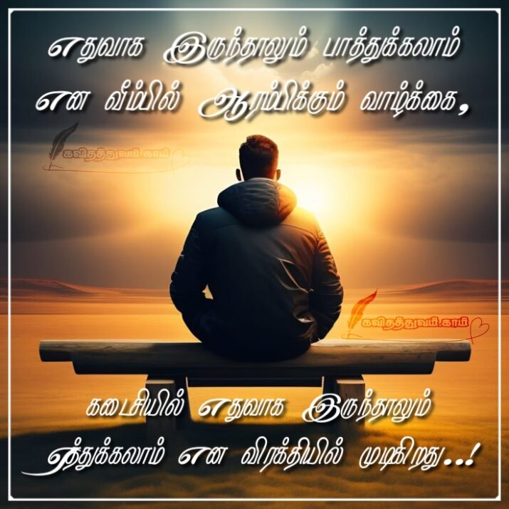 எதுவாக இருந்தாலும் பாத்துக்கலாம் என வீம்பில் ஆரம்பிக்கும் வாழ்க்கை, கடைசியில் எதுவாக இருந்தாலும் ஏத்துக்கலாம் என விரக்தியில் முடிகிறது..! 0 kavithathuvam.com on October 20, 2025 Share on Facebook Framed Photos ==>>CLICK HEAR TO VIEW<<== Lord Murugan Photos | Lord Shiva Photos | Radhakrishnan And Shivan Parvathi Photos | Jesus Photos | Mother Mary Photos | St Antony Photos | Bible Verse Photo Frames Download பார்த்தவர்கள் எண்ணிக்கை: 19 படித்து பிடித்ததை பகிர்ந்து படிக்க வையுங்கள்: Share Whatsapp Messenger Post Pinterest Print Share Email வாழ்க்கை கவிதைகள்