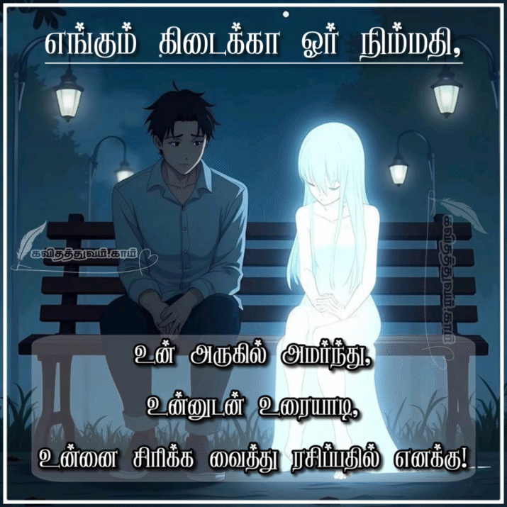 எங்கும் கிடைக்கா ஓர் நிம்மதி, உன் அருகில் அமர்ந்து, உன்னுடன் உரையாடி, உன்னை சிரிக்க வைத்து ரசிப்பதில் எனக்கு!