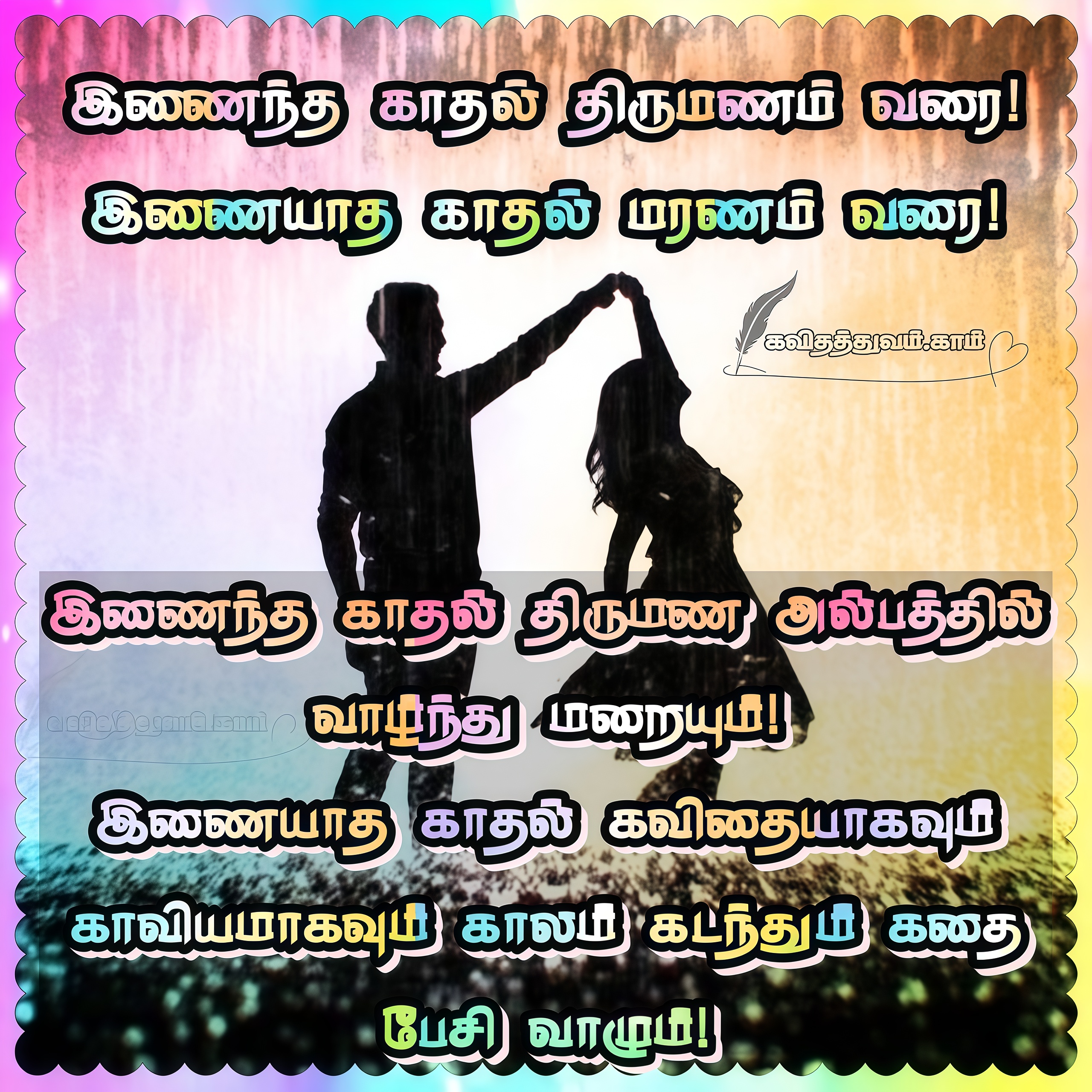 இணைந்த காதல் திருமணம் வரை! இணையாத காதல் மரணம் வரை! இணைந்த காதல் திருமண அல்பத்தில் வாழ்ந்து மறையும்! இணையாத காதல் கவிதையாகவும் காவியமாகவும் காலம் கடந்தும் கதை பேசி வாழும்!