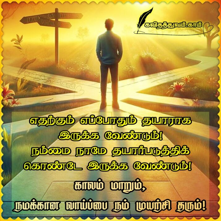 எதற்கும் எப்போதும் தயாராக இருக்க வேண்டும்! நம்மை நாமே தயார்படுத்திக் கொண்டே இருக்க வேண்டும்! காலம் மாறும், நமக்கான வாய்ப்பை நம் முயற்சி தரும்! 0 kavithathuvam.com on December 8, 2025 Share on Facebook Framed Photos ==>>CLICK HEAR TO VIEW<<== Lord Murugan Photos | Lord Shiva Photos | Radhakrishnan And Shivan Parvathi Photos | Jesus Photos | Mother Mary Photos | St Antony Photos | Bible Verse Photo Frames Download பார்த்தவர்கள் எண்ணிக்கை: 41 படித்து பிடித்ததை பகிர்ந்து படிக்க வையுங்கள்: Share Whatsapp Messenger Post Pinterest Print Share Email ஊக்குவிப்பு கவிதைகள் முயற்சிவாய்ப்பு