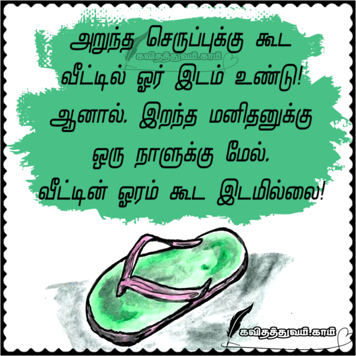 அறுந்த செருப்புக்கு கூட வீட்டில் ஓர் இடம் உண்டு! ஆனால், இறந்த மனிதனுக்கு ஒரு நாளுக்கு மேல், வீட்டின் ஓரம் கூட இடமில்லை! 0 kavithathuvam.com on June 6, 2024 Share on Facebook Framed Photos ==>>CLICK HEAR TO VIEW<<== Lord Murugan Photos | Lord Shiva Photos | Radhakrishnan And Shivan Parvathi Photos | Jesus Photos | Mother Mary Photos | St Antony Photos | Bible Verse Photo Frames Download பார்த்தவர்கள் எண்ணிக்கை: 151 படித்து பிடித்ததை பகிர்ந்து படிக்க வையுங்கள்: Share Whatsapp Messenger Post Pinterest Print Share Email வாழ்க்கை கவிதைகள் செருப்பு