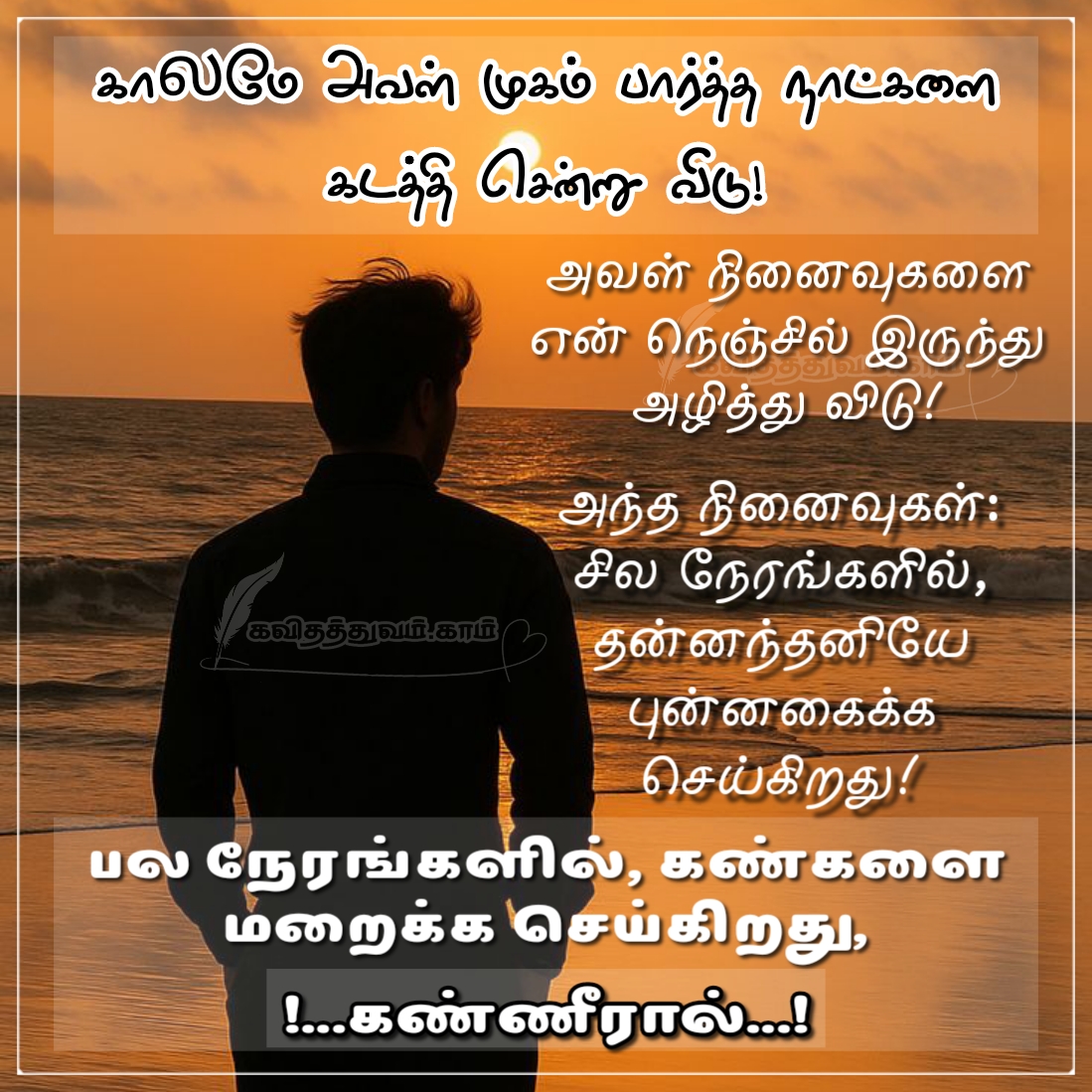காலமே அவள் முகம் பார்த்த நாட்களை கடத்தி சென்று விடு! அவள் நினைவுகளை என் நெஞ்சில் இருந்து அழித்து விடு!அந்த நினைவுகள்: சில நேரங்களில், தன்னந்தனியே புன்னகைக்க செய்கிறது! பல நேரங்களில், கண்களை மறைக்க செய்கிறது, !…கண்ணீரால்…!