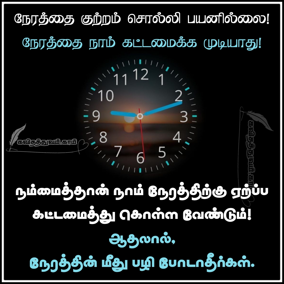 நேரத்தை குற்றம் சொல்லி பயனில்லை! நேரத்தை நாம் கட்டமைக்க முடியாது. நம்மைத்தான் நாம் நேரத்திற்கு ஏற்ப்ப கட்டமைத்து கொள்ள வேண்டும். ஆதலால், நேரத்தின் மீது பழி போடாதீர்கள்.